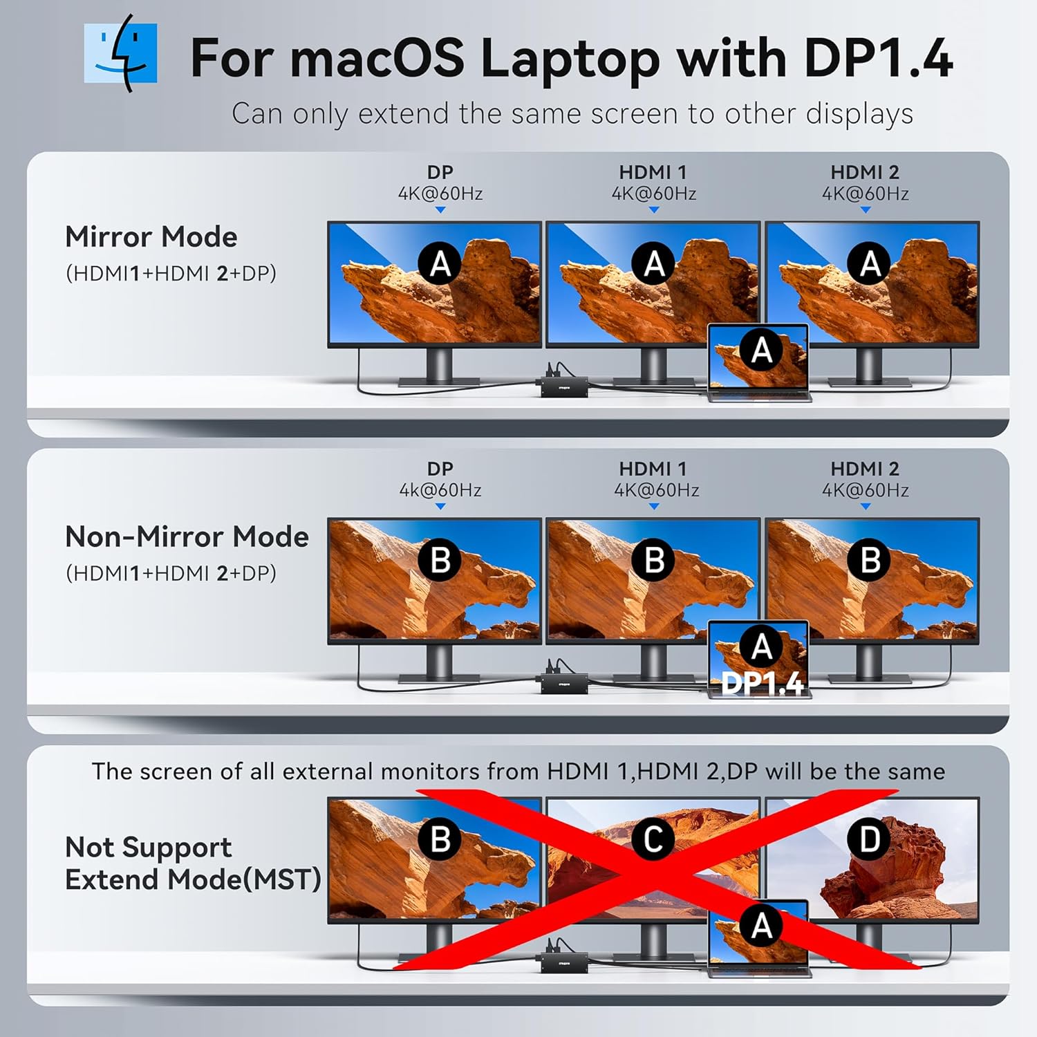 - 4K Dual Monitor&Triple Display: The docking Station dual monitor can easily to achieve dual-monitor and triple-monitor displays for Windows.Single use HDMI max up to 4K@60Hz,DP up to 8K@30Hz(DP1.4). When connect 2 displays,the resolution will be dual 4K@60Hz(DP1.4). Display output will be dual 4K@60Hz and 4K@30Hz when triple display(DP1.4) .When connecting 3 monitors and only two monitors are displayed,please plug in the DP port first,then plug in the 2 HDMI ports.Mac OS ONLY Support Mirror Mode