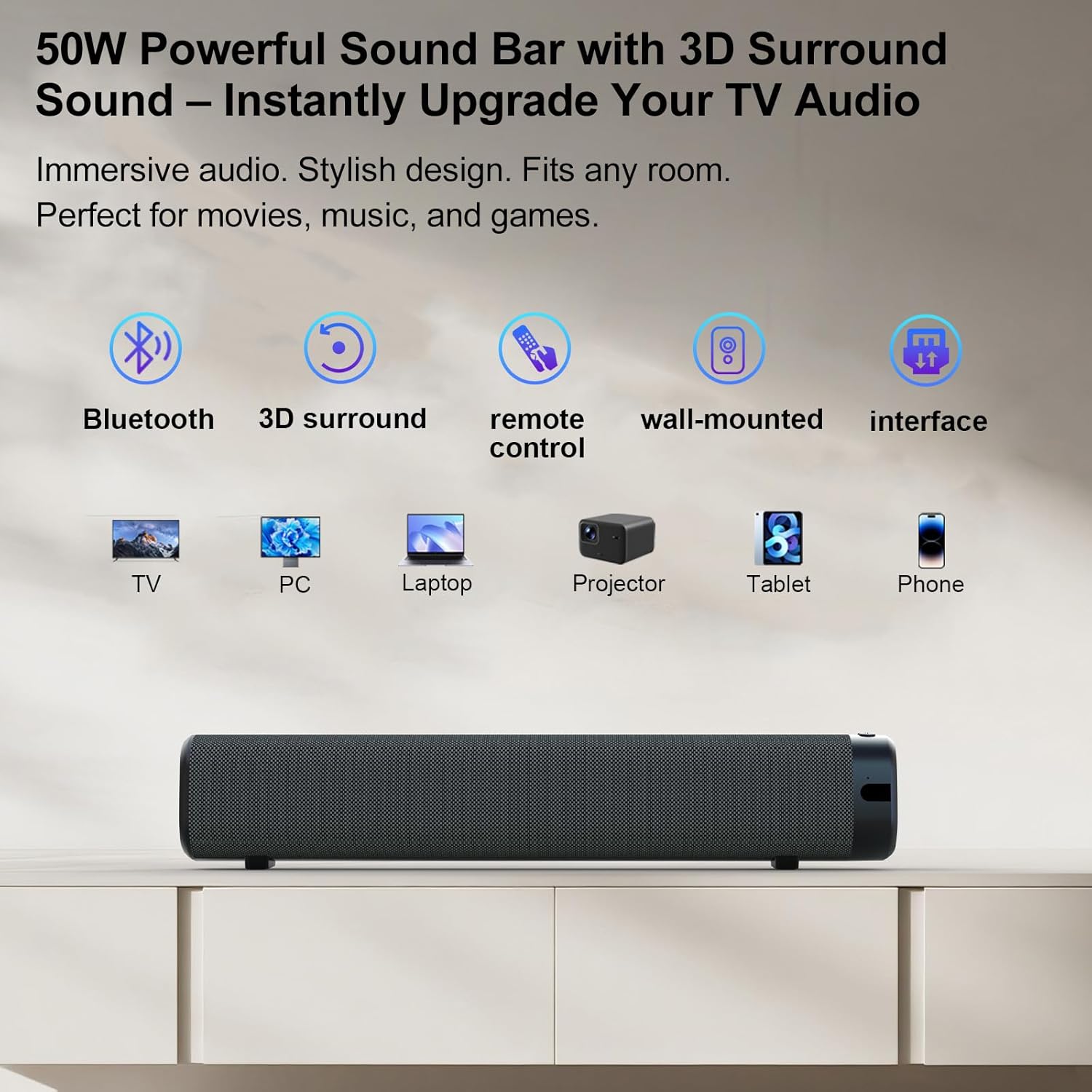 - Immersive 3D surround sound system for tv Experience Experience immersive 3D surround sound with our 50W sound bar, delivering powerful, room-filling audio. Ideal for movies, gaming, and music, it transforms your TV into a complete home theater system.