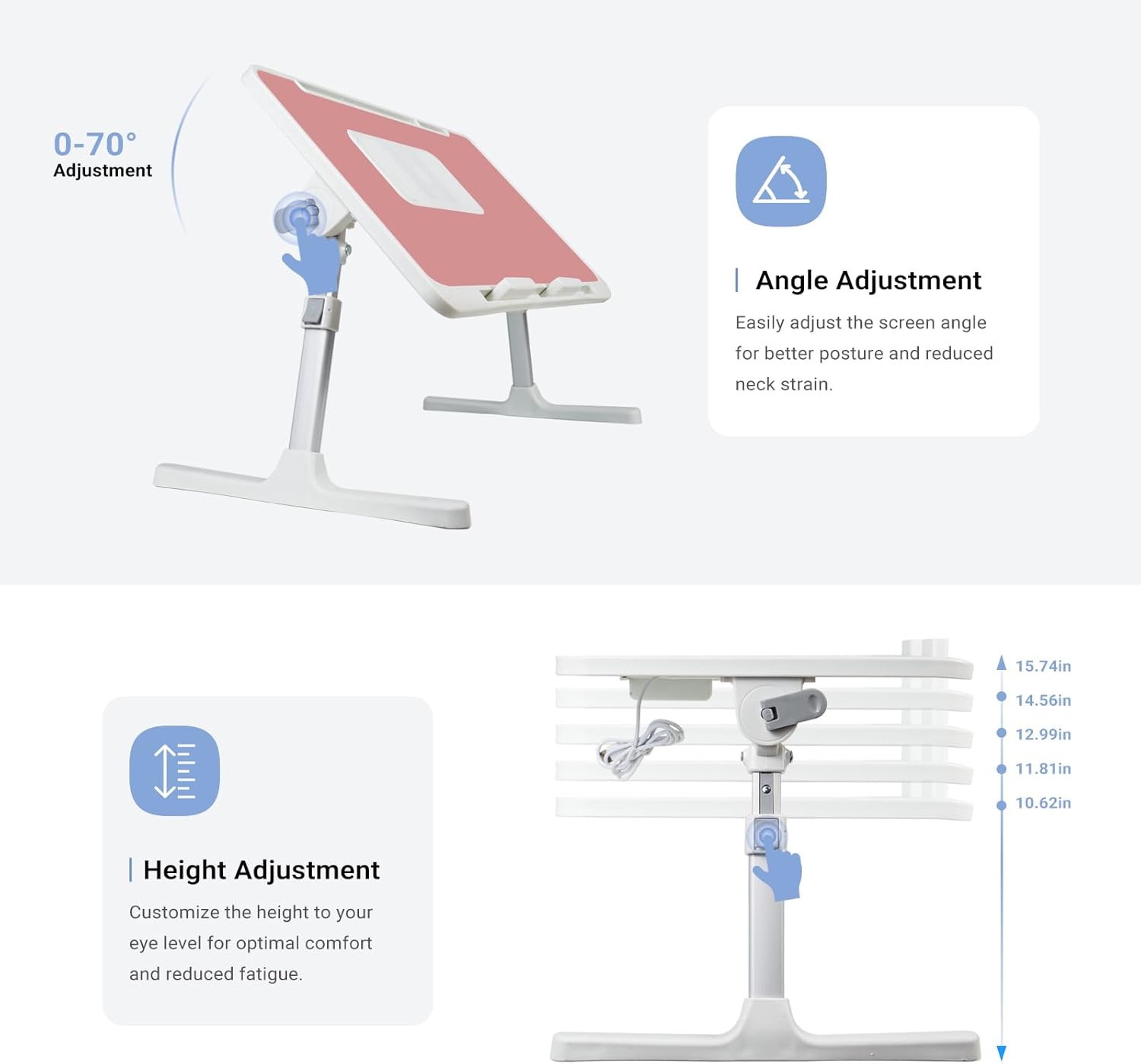 - 【📐Adjustable Size for Optimal Use】Measuring 22.04 x 12.59 inches(56*32cm), this height-adjustable laptop table adapts from 9.84" to 14.17"(25-36cm), thanks to its convenient auto-lock buttons. Its foldable legs ensure easy storage, and the 21.25 inches leg clearance offers comfortable movement. The tabletop's angle is adjustable up to 70°, promoting better posture and reducing strain.