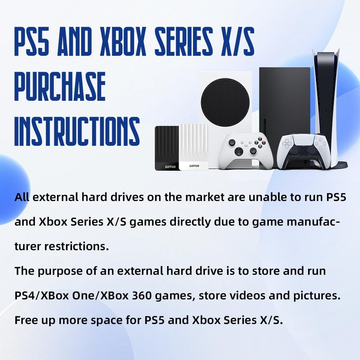 - 【Gaming device manufacturer restrictions for different generations of games】Due to restrictions imposed by gaming device manufacturers, the PS5 can read and run PS4 games directly from an external hard drive, but cannot run PS5 games directly from an external hard drive; PS5 games on the external hard drive need to be moved to the device in order to run. Similarly, the Xbox X Series and Xbox S Series can only run Xbox One games directly from an external hard drive.