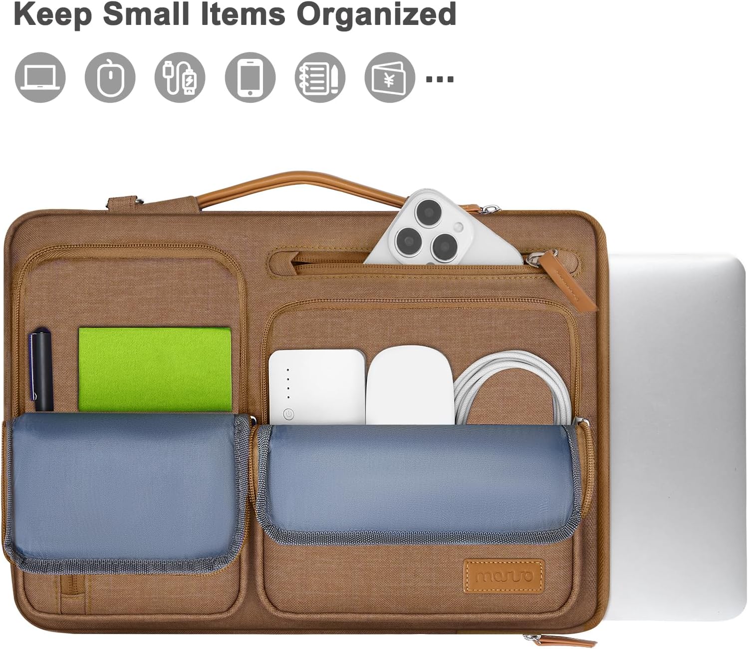 - The main inner compartment for laptop or tablet. Front 4 zipper pockets is great for quick-access and store cell phone, pen slots, wallet, keys and other small items.