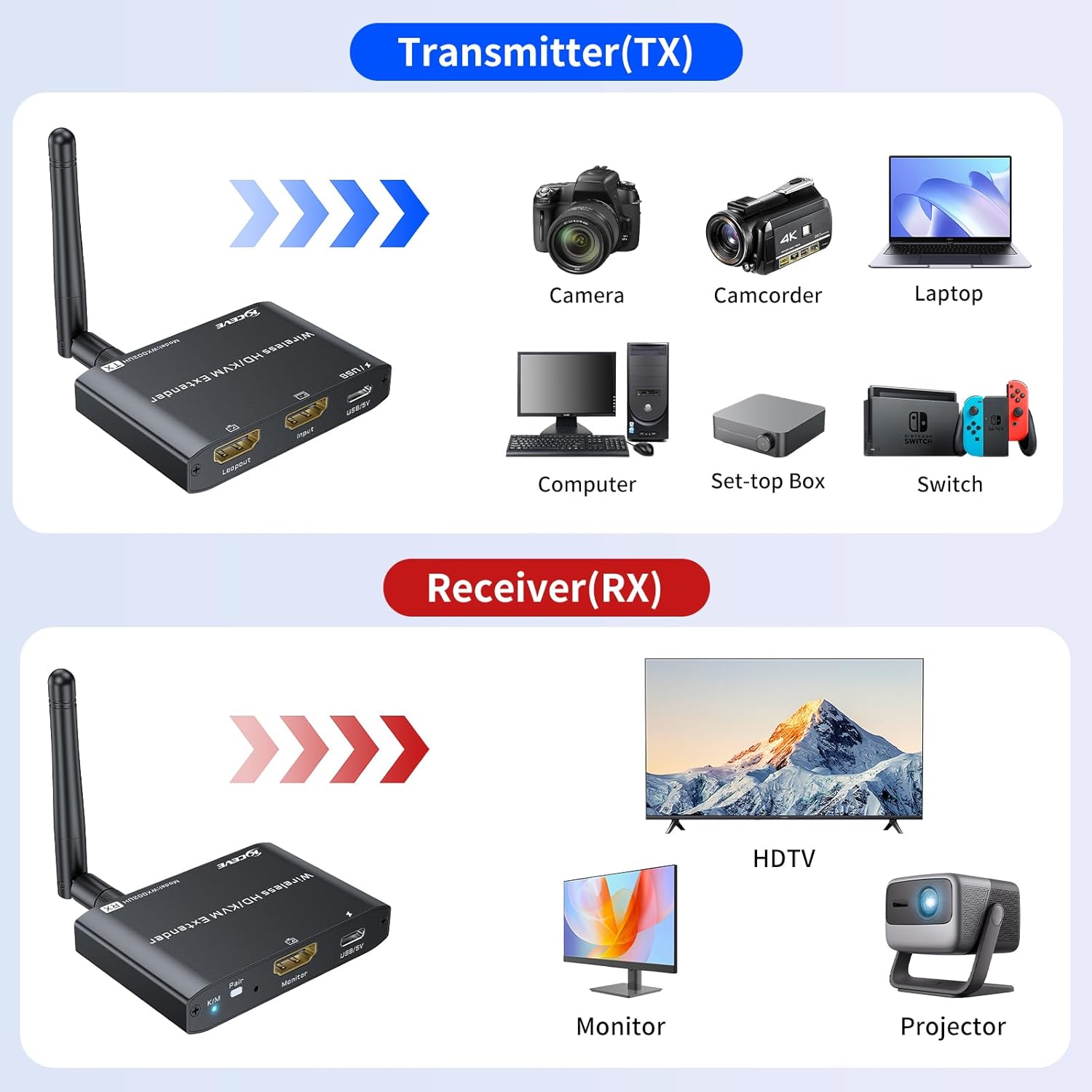 - ă200M/660FT Wireless HDMI Transmitter and ReceiverăKCEVE Wireless HDMI transmitter and receiver with low latency and long transmission distance. 200M/660FT for Outdoor Open Area, 150M/500FT for Indoor without barriers, 30M/100FT for Indoor through a wall. Do not put two walls between the wireless HDMI transmitter and the wireless HDMI receiver. It is best to use it in an obstacle-free space to avoid reducing efficiency