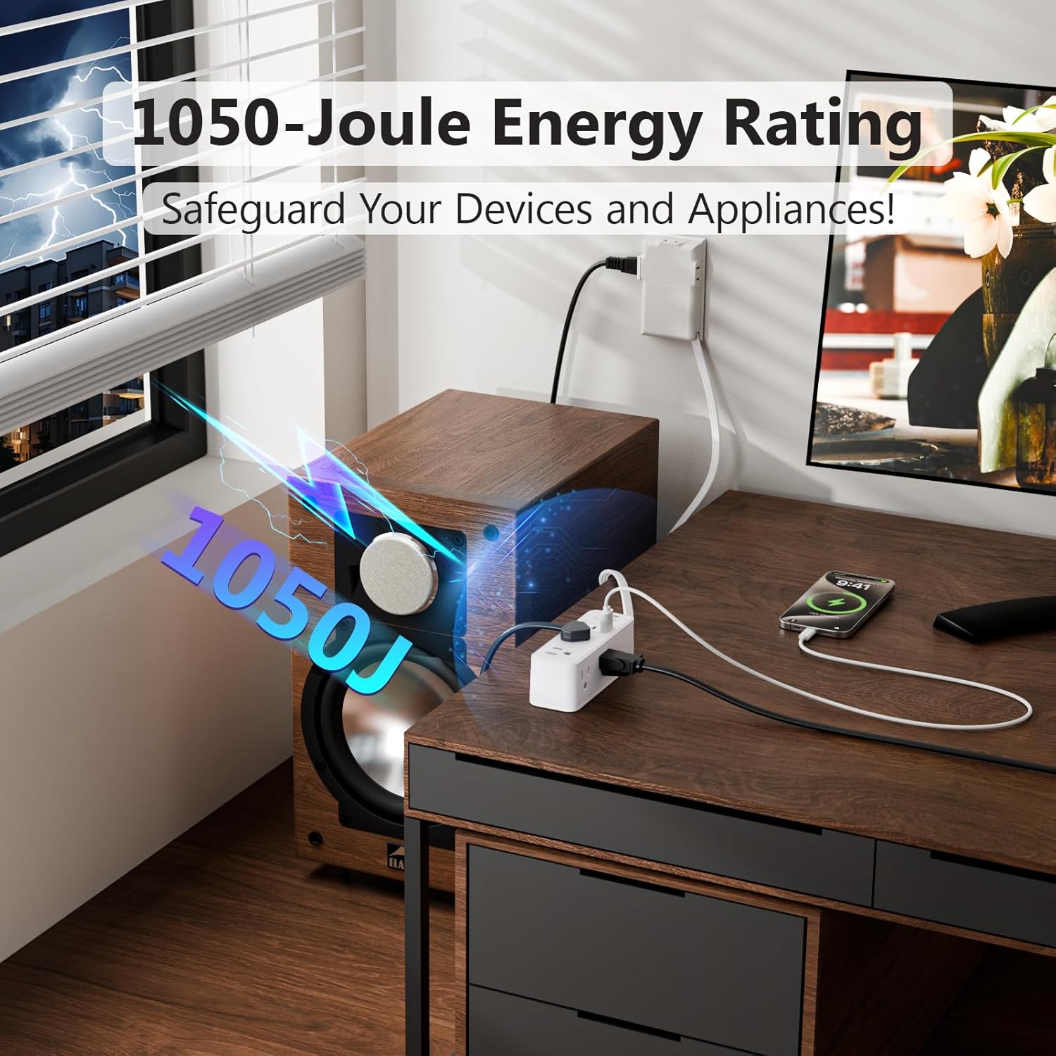 Power Strip Surge Protector with Flat Extension Cord Outlet Cover 6 AC Outlets(3 Wall Outlets Extender) 3 USB Ports (2USB C), 1050 Joules, Multi Plug for Home Office College Dorm Room Essential