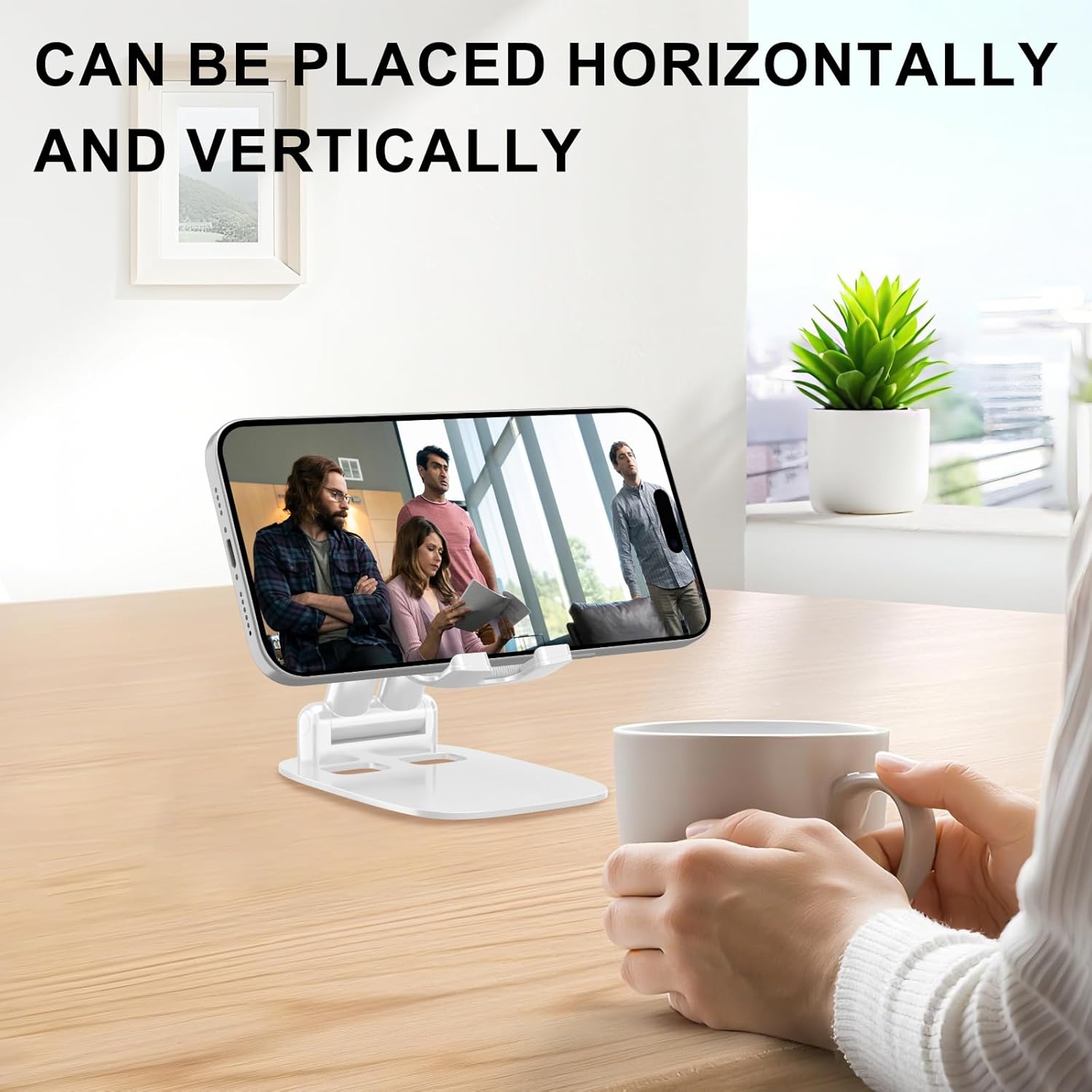 DEERLAMN Cell Phone Stand for Desk, Height Adjustable Cell Phone Holder Portable Desktop Stand, Travel Home Office Desk Accessories Compatible with iPhone 16/15/14/13/12/11 All Smartphone - White