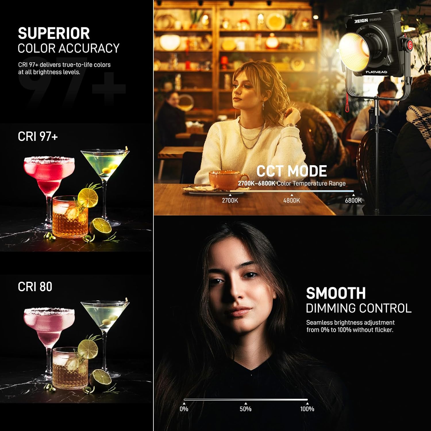 - PROFESSIONAL-GRADE LIGHTING FOR DIVERSE SCENARIOS:400W COB LED delivers 2700K-6800K CCT range with 97+ CRI/TLCI for cinema-grade color accuracy and flicker-free performance, Designed for seasoned photography enthusiasts, this product excels in live streaming, outdoor shoots, film/TV production, studio photography, and YouTube content creation, delivering versatile performance across demanding environments.