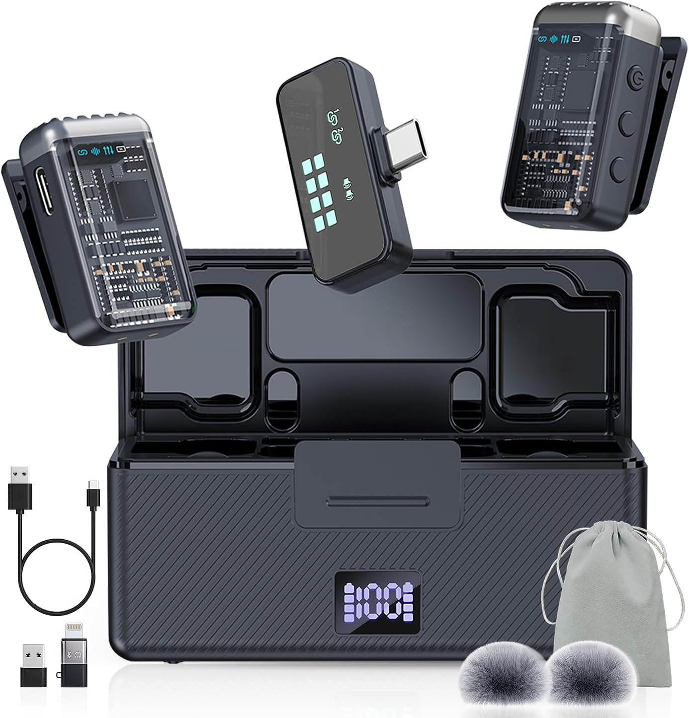 - Included Components : 1 C-A Adapter Cable, 1 Charging case, 1 Lightning Adapter, 1 Type-C Receiver, 2 Lavalier Microphones