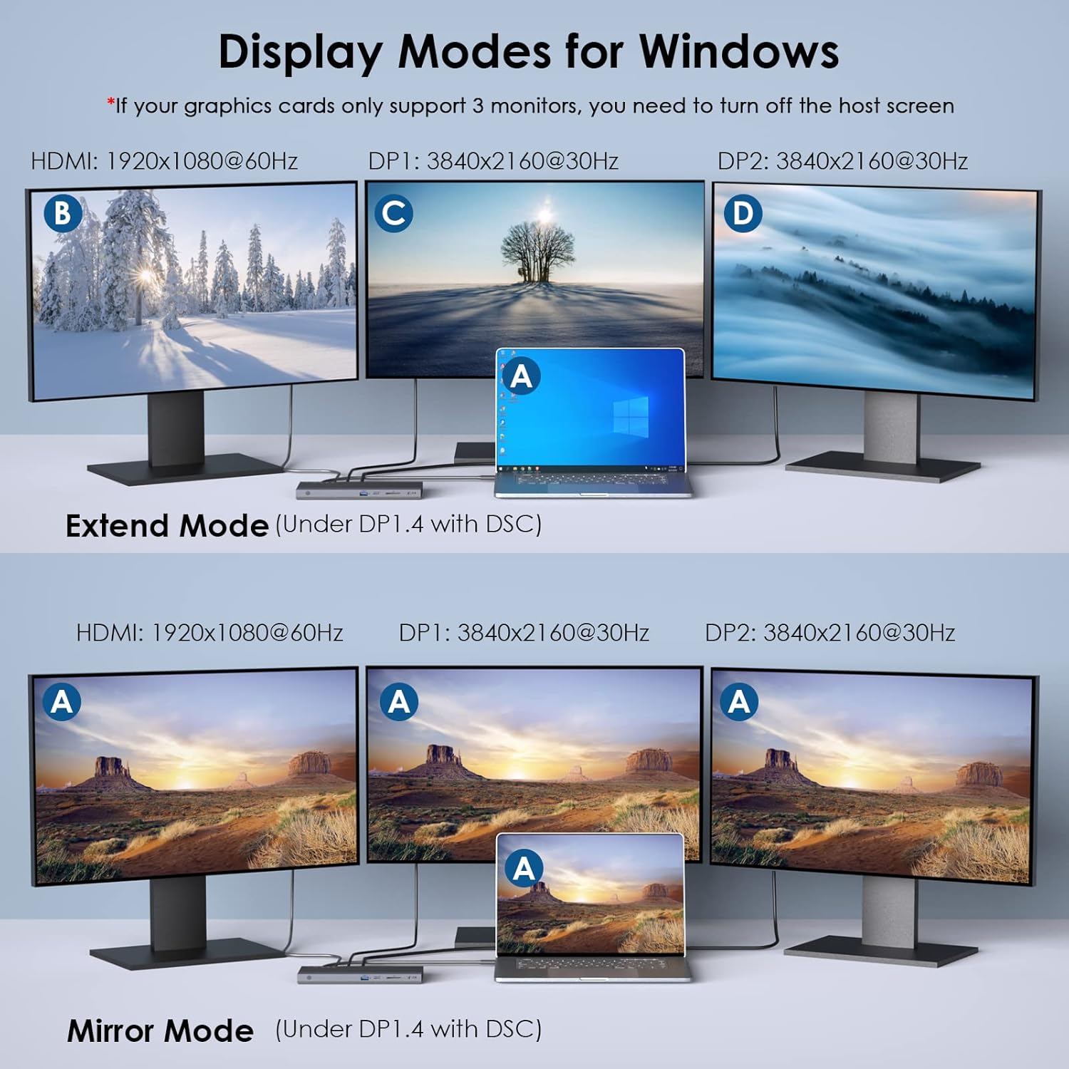- Triple Display or Dual Monitor: Equipped with dual DP and one HDMI port,Single DP can up to 4K@144Hz under DP1.4 source. Resolution will be 4K@60Hz if two monitors play simultaneously.Connect up to three monitors simultaneously.it perfect for expanding multiple displays for meetings, presentations, stock chart analysis, programming, and more.(Pls Not: Please make sure that the USB-C port on the host laptop supports video output)