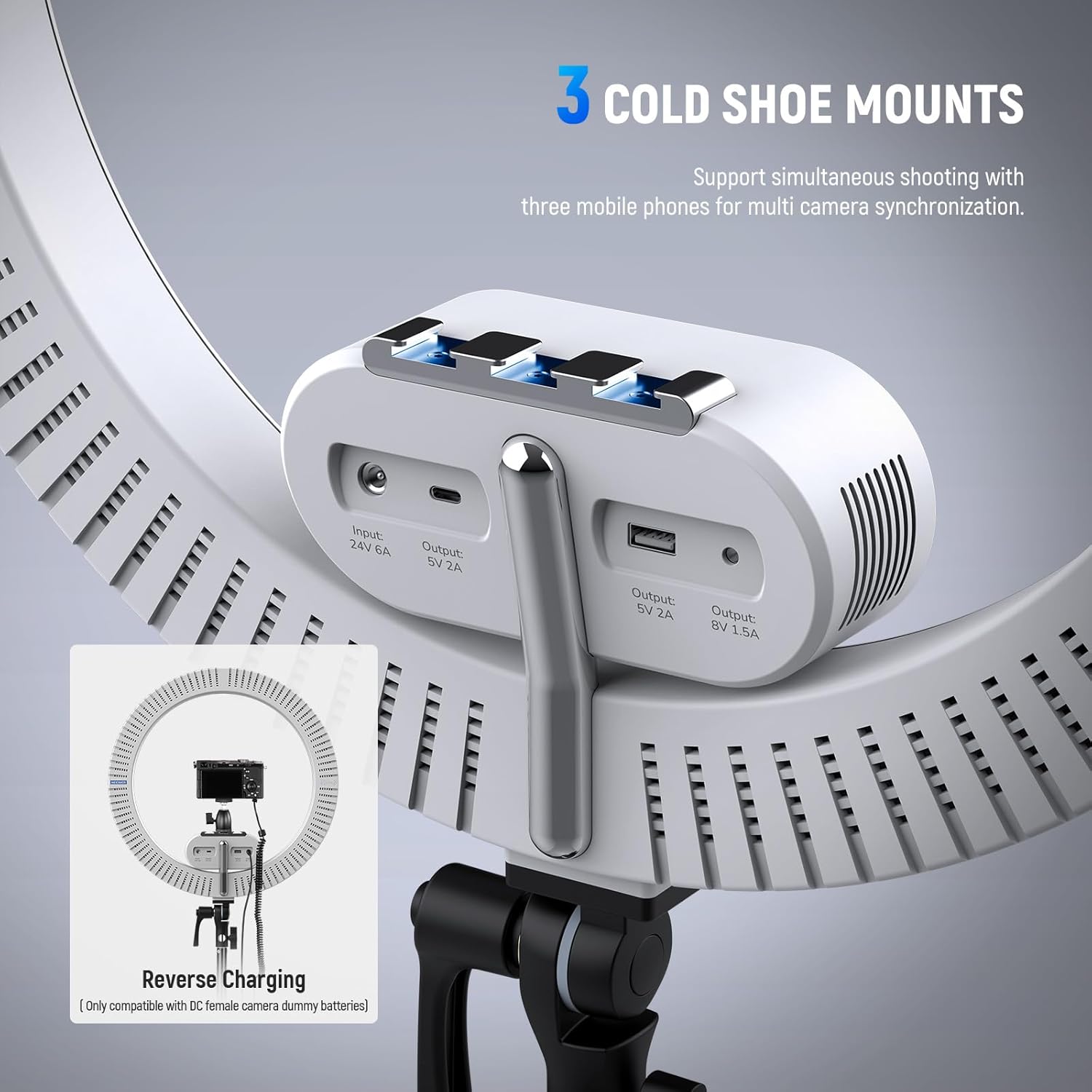 - 【3 Cold Shoe Mounts & 3 Phone Holders】 With 3 cold shoe and 3 flexible cell phone holder, the tall ringlight with tripod is compatible with camera iPhone Android. Holds up to 3 phones simultaneously for multi angle video recording, overhead photos or streaming on multiple platforms at the same time. With Type C, USB, and DC output ports, the ring light also supports reverse charging for phones, laptops, and other compatible devices during filming, versatile for content creators and streamers