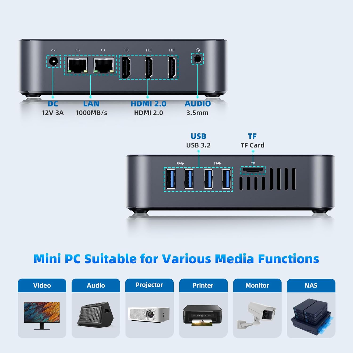 - Versatile Connectivity Hub: Ready for Anything Connect it all! This feature-rich mini pc boasts extensive ports: 1x DC, 4x USB 3.2, Dual Gigabit Ethernet, 3x HDMI, and Audio In/Out. Stay connected wirelessly with Dual-Band WiFi 5 (2.4G + 5.0G) and Bluetooth 5.0. Effortlessly link peripherals (mouse, keyboard, headphones), servers, monitors, projectors, TVs, office equipment, and more.