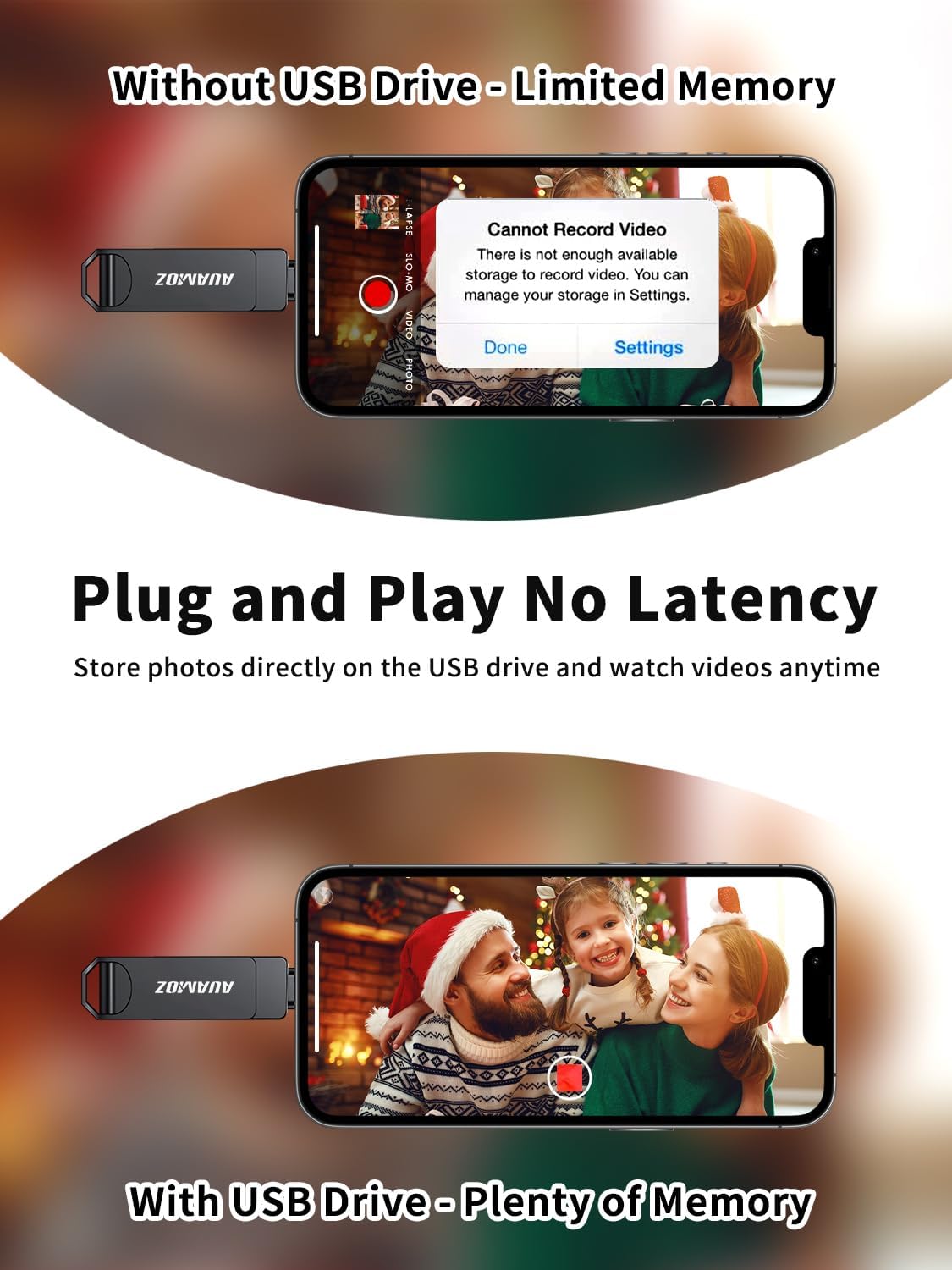 - 【3 in 1 Multi-Port USB Drive】Our versatile USB drive features separate USB-C, USB-L, and USB ports (Adapter), streamlining data transfer between devices. Say goodbye to cables, iTunes, and iCloud restrictions. Compatible with iPhone 16/15/14/13 series, iPad Air/Pro, Android smartphones (with OTG enabled), and computers. (Note: Requires iOS 13 or higher for iPhone; Android devices must support OTG)