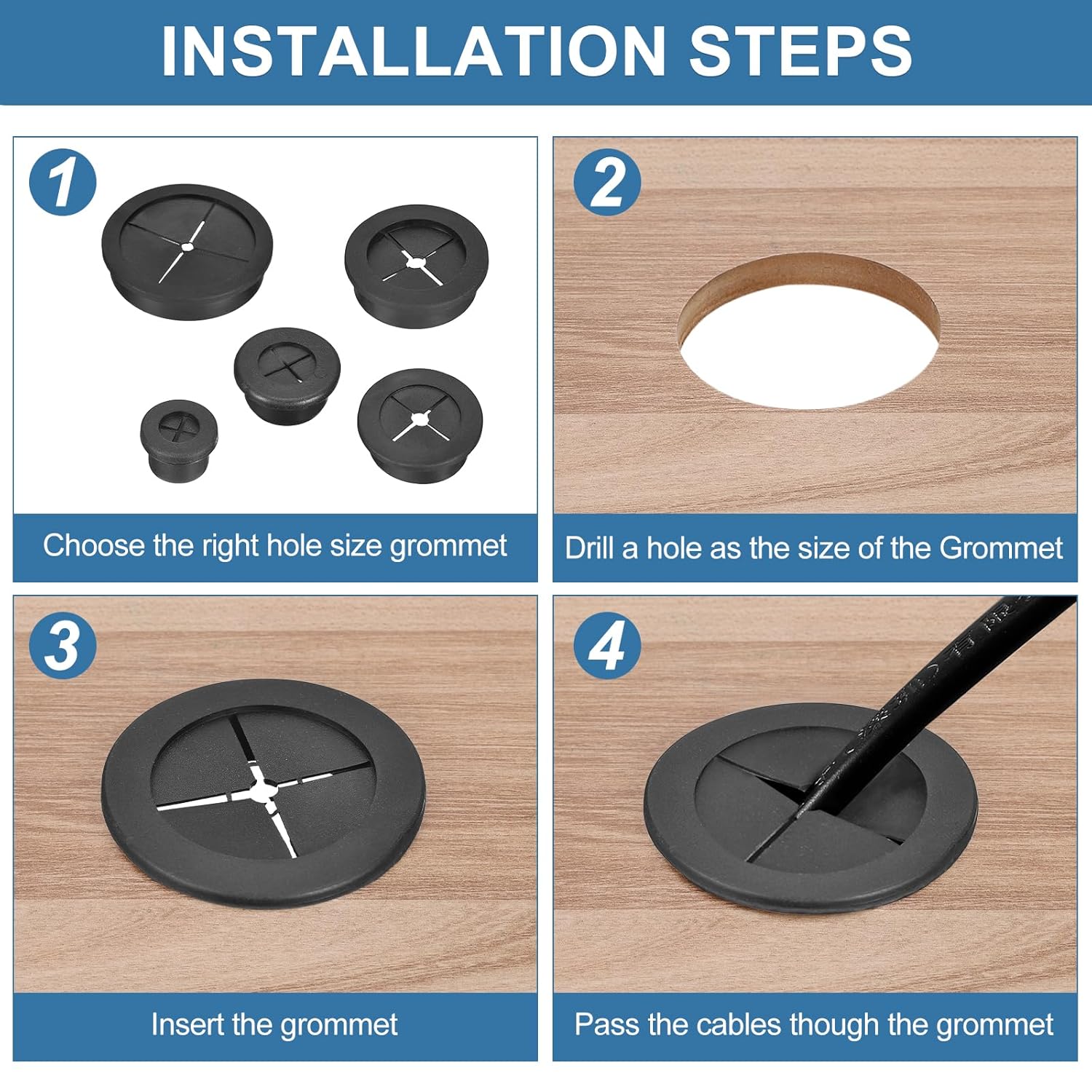 - Installation: The grommet is easy to use, eliminating the need for screws or nuts to secure it, just need to insert the desk grommets into pre-drilled holes. Using the included nylon cable ties can reduce cable clutter and keep cables organized and clean