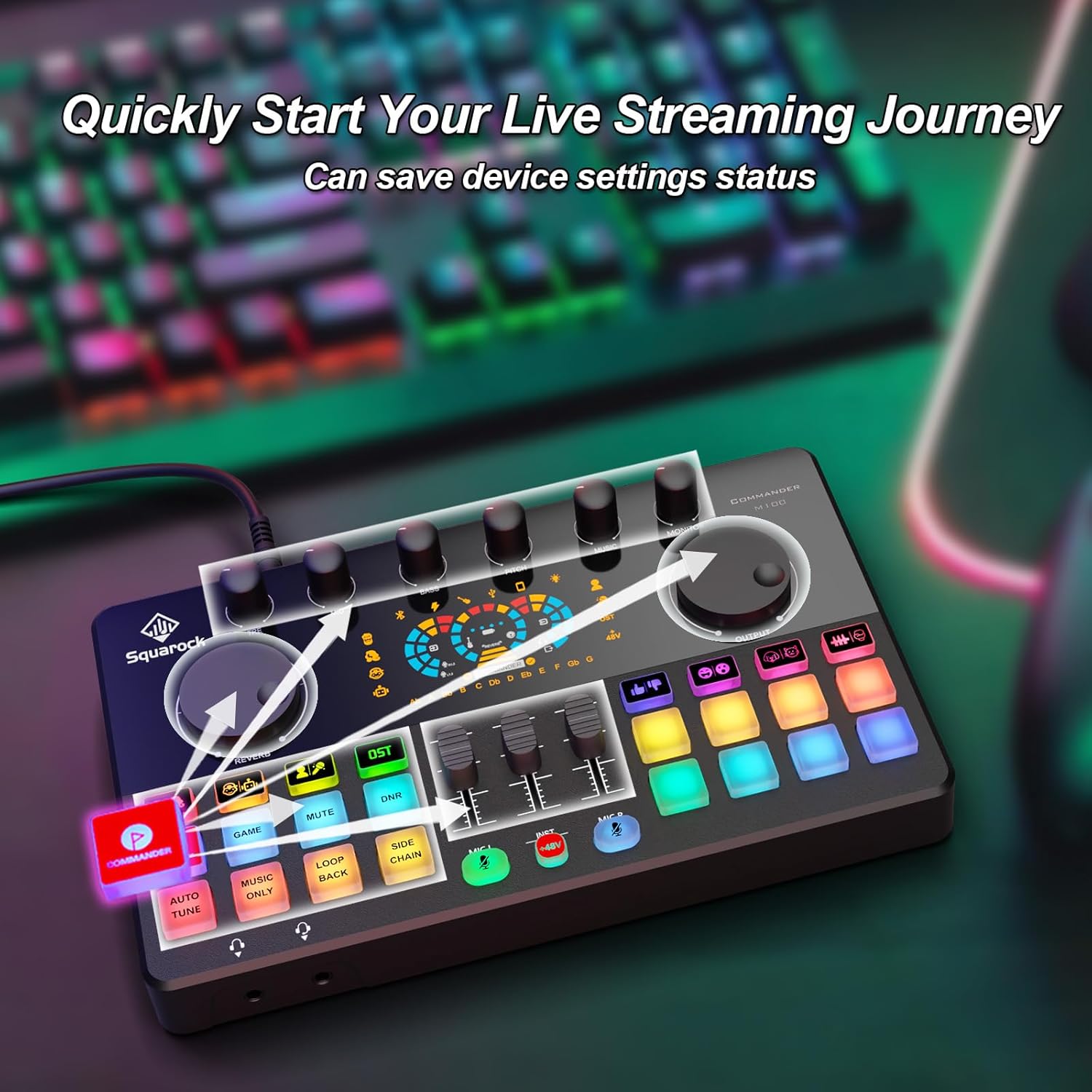 - Commander Button:The commander button will save your device settings, which includes music, listening, reverb, output, MIC L, MIC R, INST, and sound mode buttons. All settings will be saved. Whether it's turning off the device and then turning it back on, or replacing the connected device, the previous personalized settings can be instantly restored.It is especially suitable for scenarios such as live streaming and recording that require quick entry into the state, greatly improving operational efficiency. For novice users who are not familiar with audio device debugging, the function of saving button status can reduce the difficulty of use