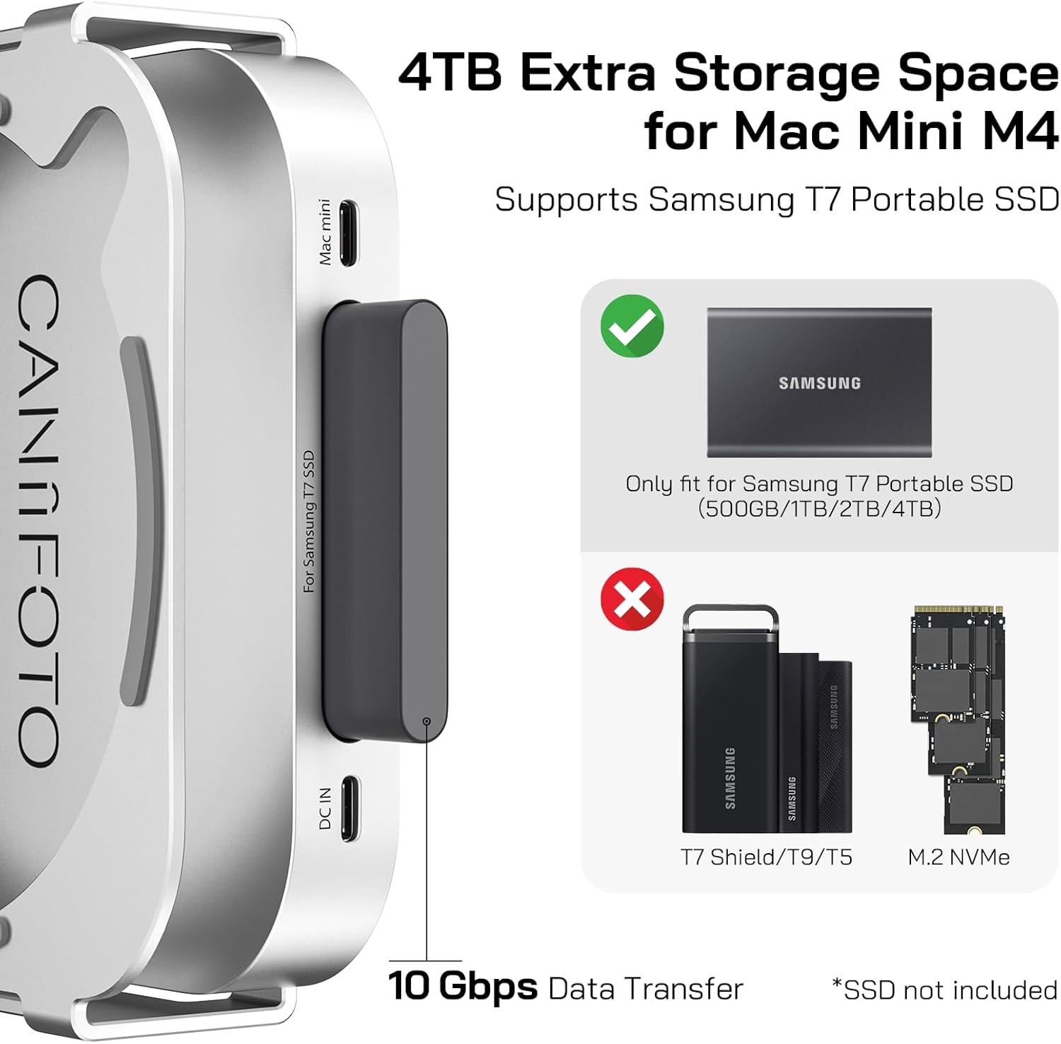 - 【Massive 4TB Expandable Storage】Expand your M-ac Mini M4 capabilities with up to 4TB internal storage. The Caniifoto M-ac Mini M4 Dock supports Sam-sung T7 Portable SSD for blazing-fast data transfer with speeds up to 10Gbps. SSD installation is very simple, plug and play, and no additional tools are required. Note: ONLY SUITABLE for Samsung T7 Portable SSD (500GB/1TB/2TB/4TB), and SSD is not included.