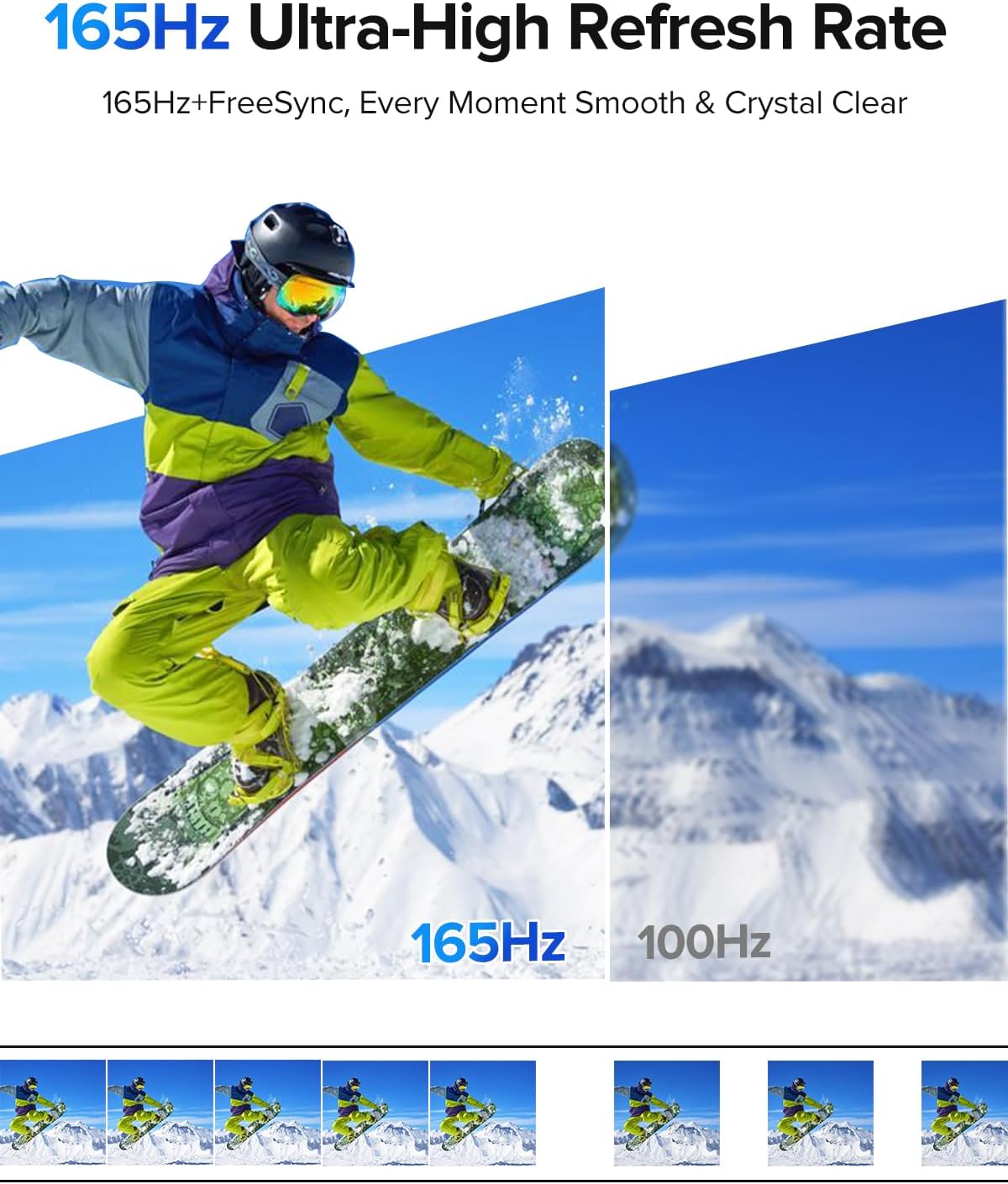 - 【165Hz for Ultimate Smoothness】165Hz ultra-high refresh rate gaming monitor, nearly three times smoother than regular 60Hz monitor and significantly reduces image trailing and tearing. Takeing you into a new realm of smooth and fluid visual.0.1ms ultra-fast response and FreeSync synchronization technology, enhance immersive gaming experience.