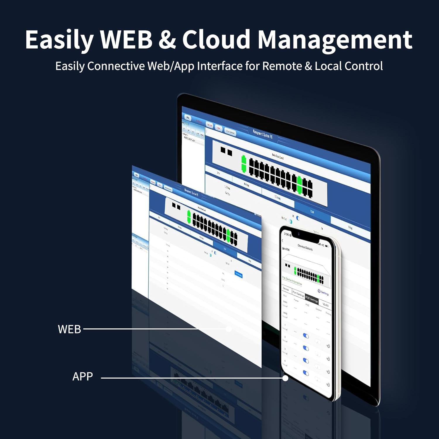 - 【Flexible Management Options】 Choose between Cloud Management or Local Web Interface. Utilize our Cloud Management feature via the free app on your smartphone, or Piad to effortlessly manage multiple compatible managed switches. Gain full visibility and control over each port, simplifying the setup and management of your internal network system.