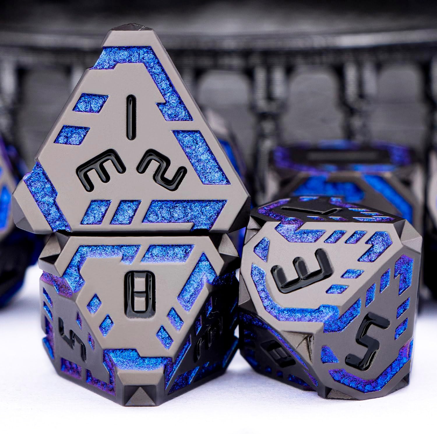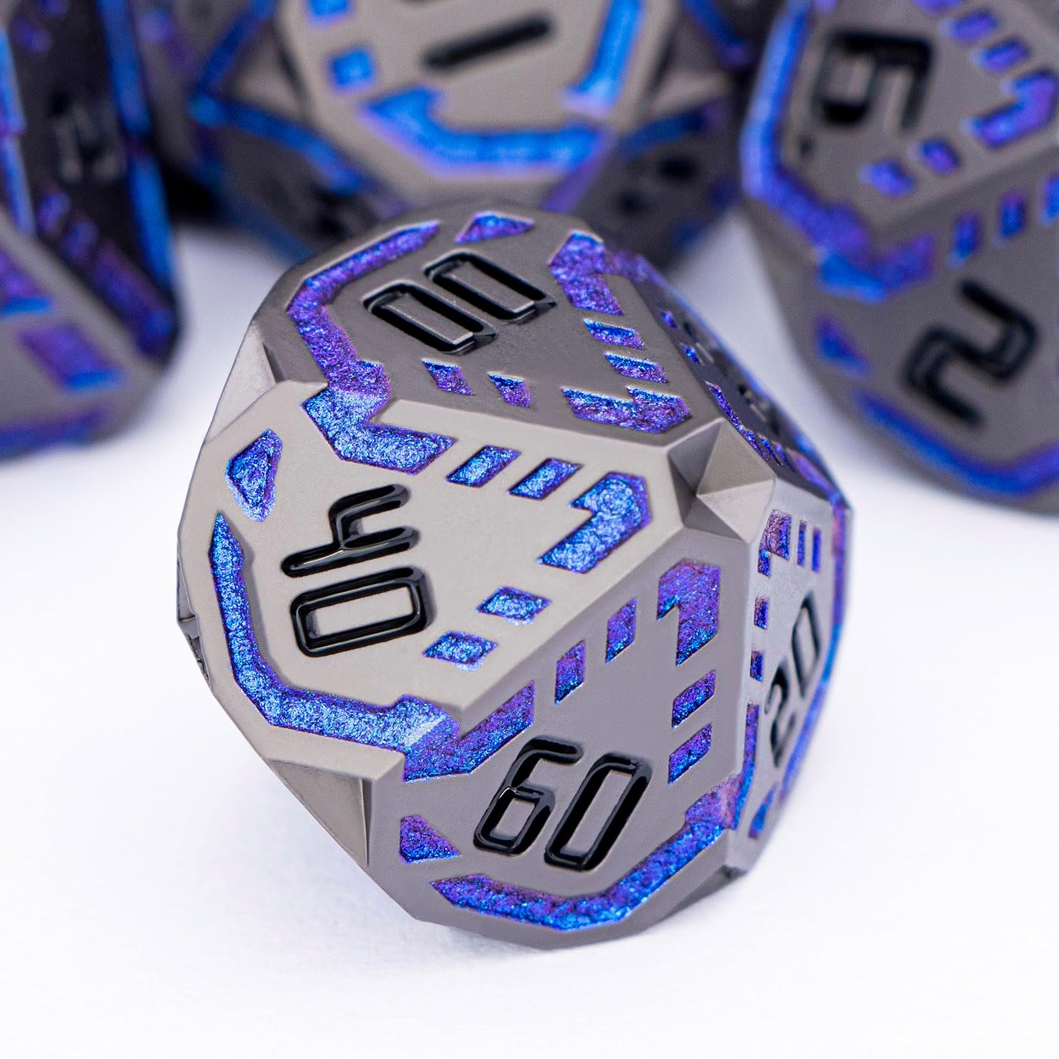 Metal DND Sci-fi Dice Set 7PCS Stripe Polyhedral Dice for Dungeons Dragons RPG Role Playing Game, Glitter D and D Dice with Gift Box D6 D8 D10 D12 D20 (Black&Blue Purple)