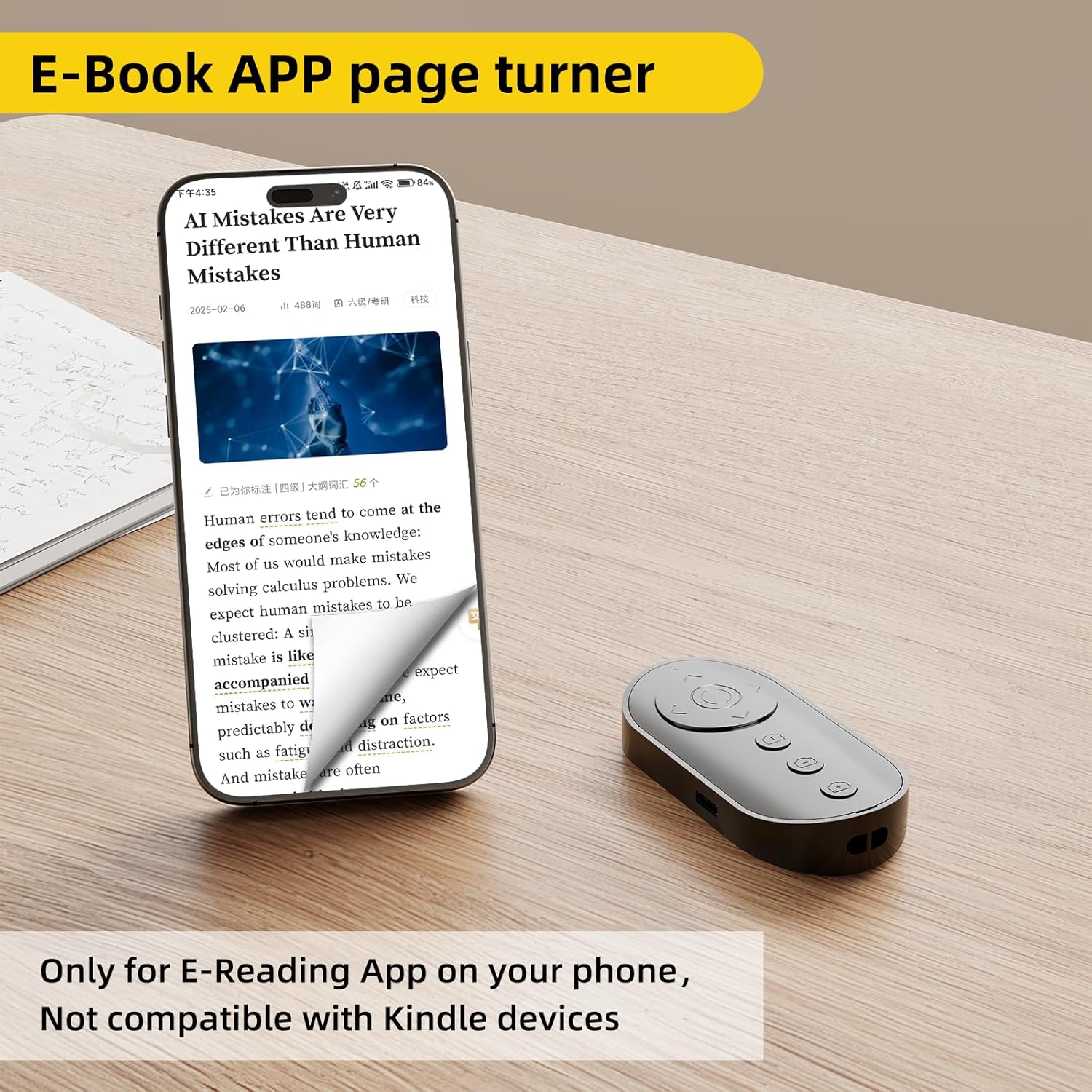 - 【E-Book App Page Turner】This wireless remote can help you control the page-turning of the E-book APP, and enjoy a comfortable reading experience. Note: ONLY available for e-book APP on Smartphone, not work for Kindle devices or any E-reader device.