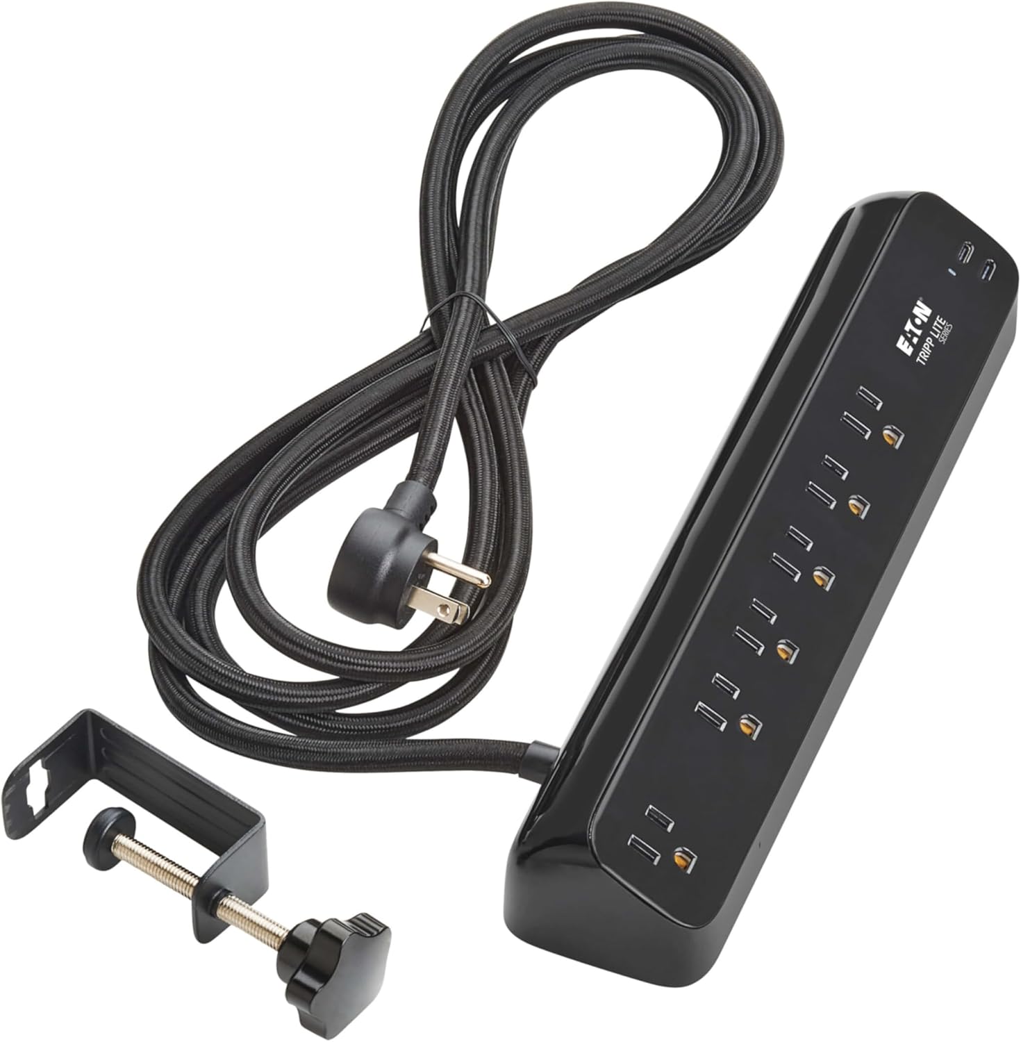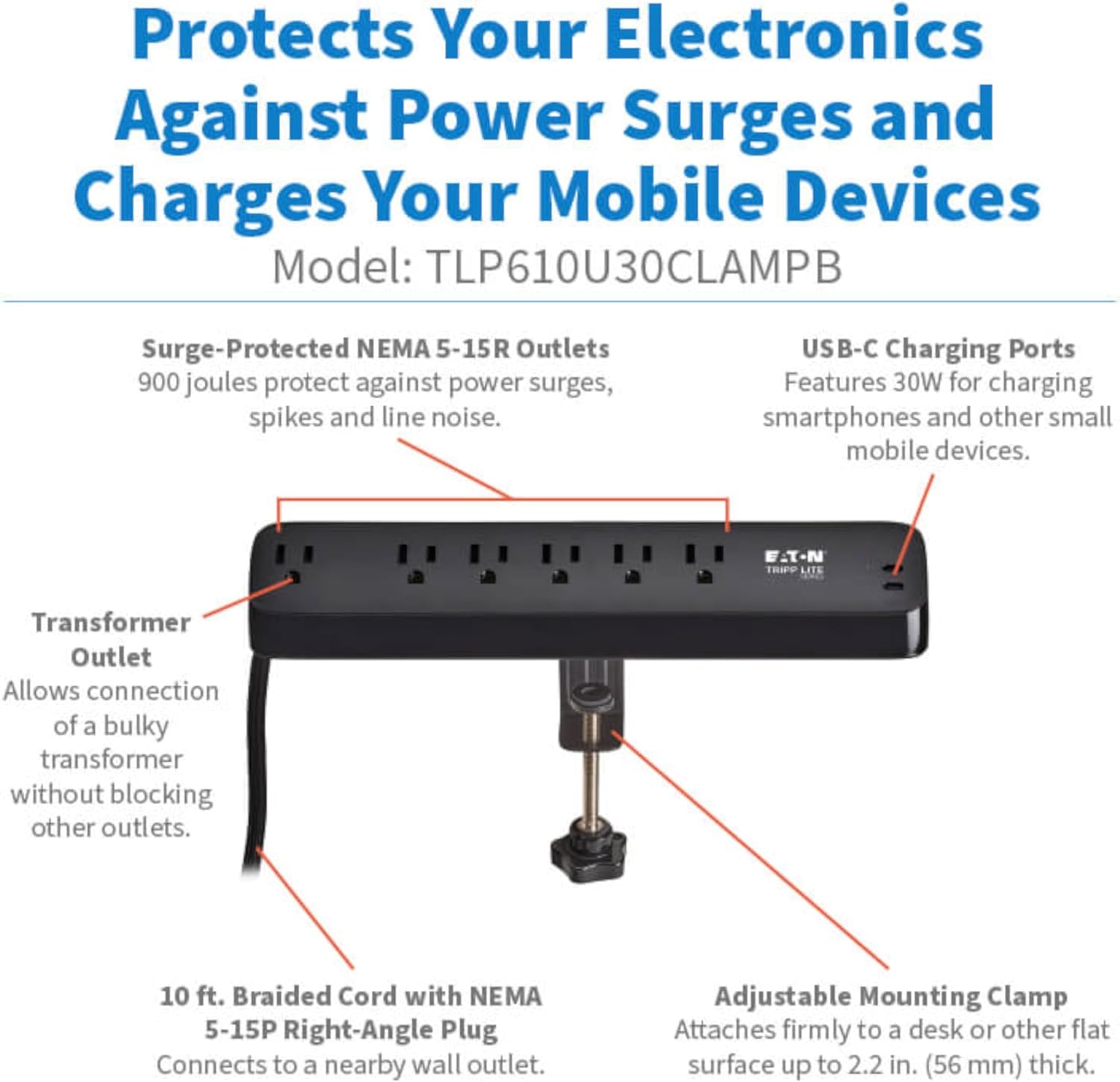 Eaton Tripp Lite series Desk Clamp Power Strip Surge Protector, 6-Outlets, 2x 30W USB-C Charging Ports, 900 Joules, 10ft Braided Flat Extension Cord, Lifetime Manufacturer's Warranty (TLP610U30CLAMPB)