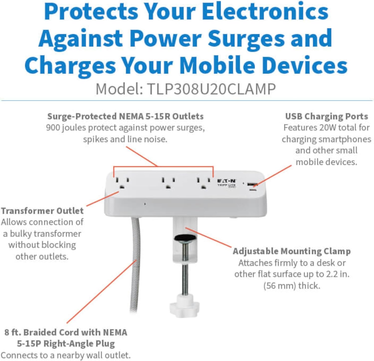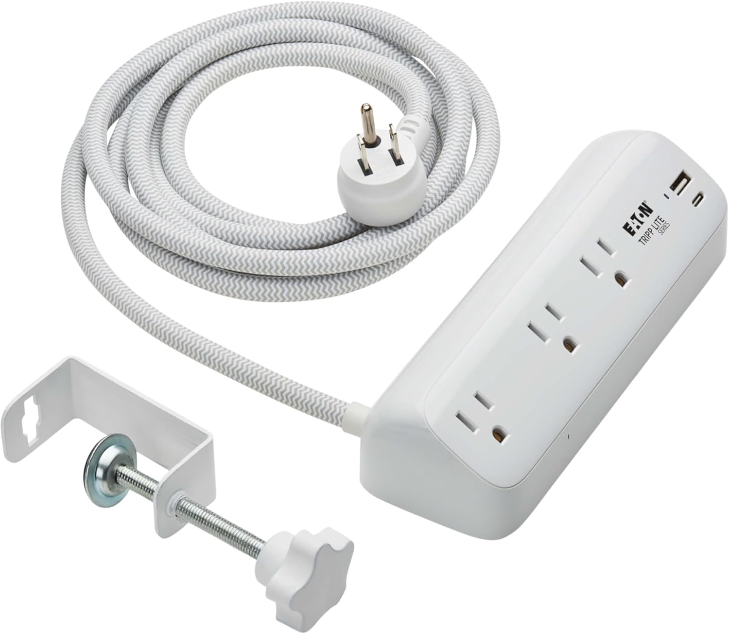 Eaton Tripp Lite Series Desk Clamp Power Strip Surge Protector, 3-Outlets, USB-A & USB-C Charging Ports, 900 Joules, 8ft Braided Flat Extension Cord, Lifetime Manufacturer's Warranty (TLP308U20CLAMP)
