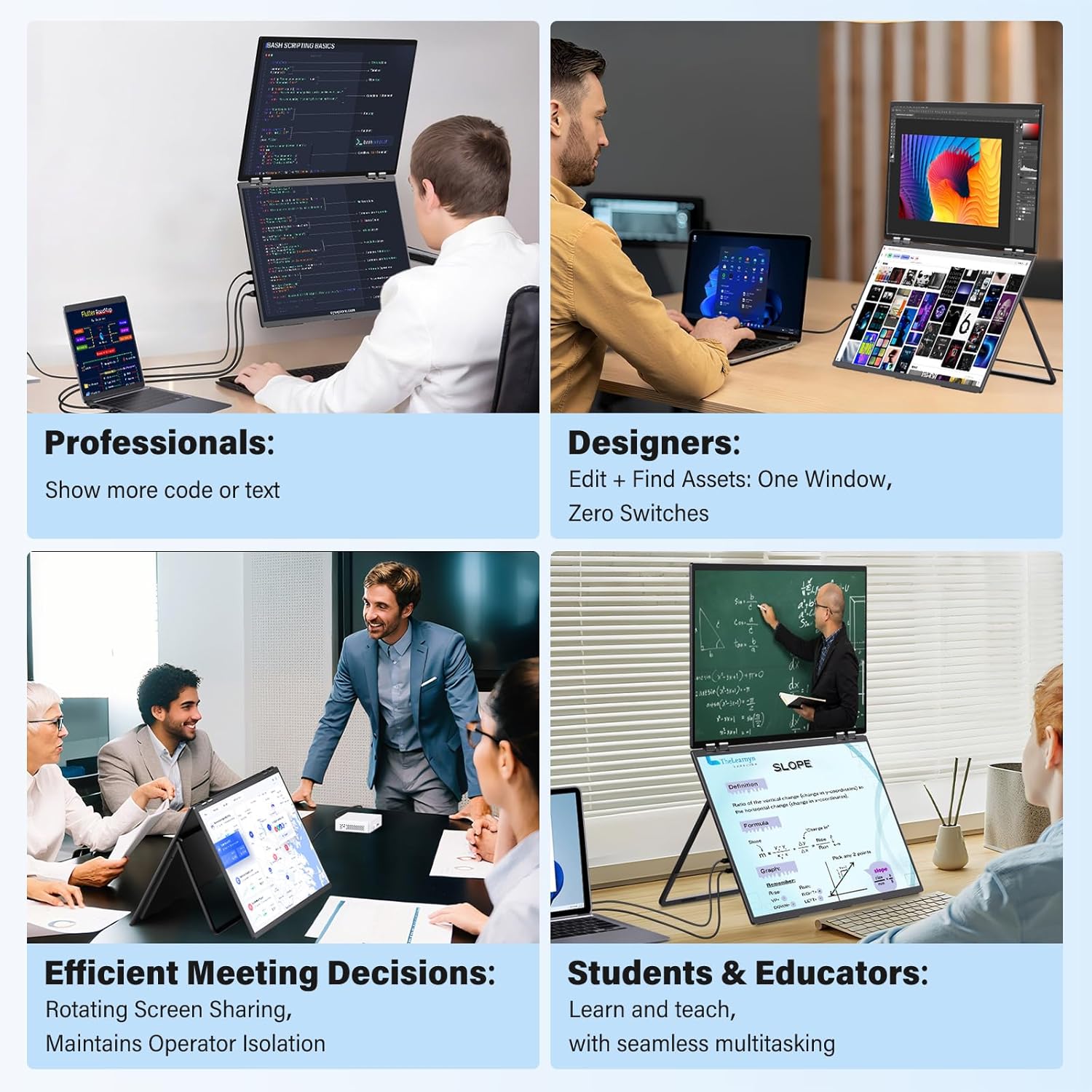 - 【Dual 23.8" Folding Screen: Double Efficiency, Save Space】 Dual monitor 4K deliver doubled workspace instantly! Eliminate window switching – collaborate with documents, code, and previews side-by-side for soaring productivity. Fold to reclaim valuable desk space in seconds.Note: Due to its large size/weight, it is not recommended to carry it out for use.