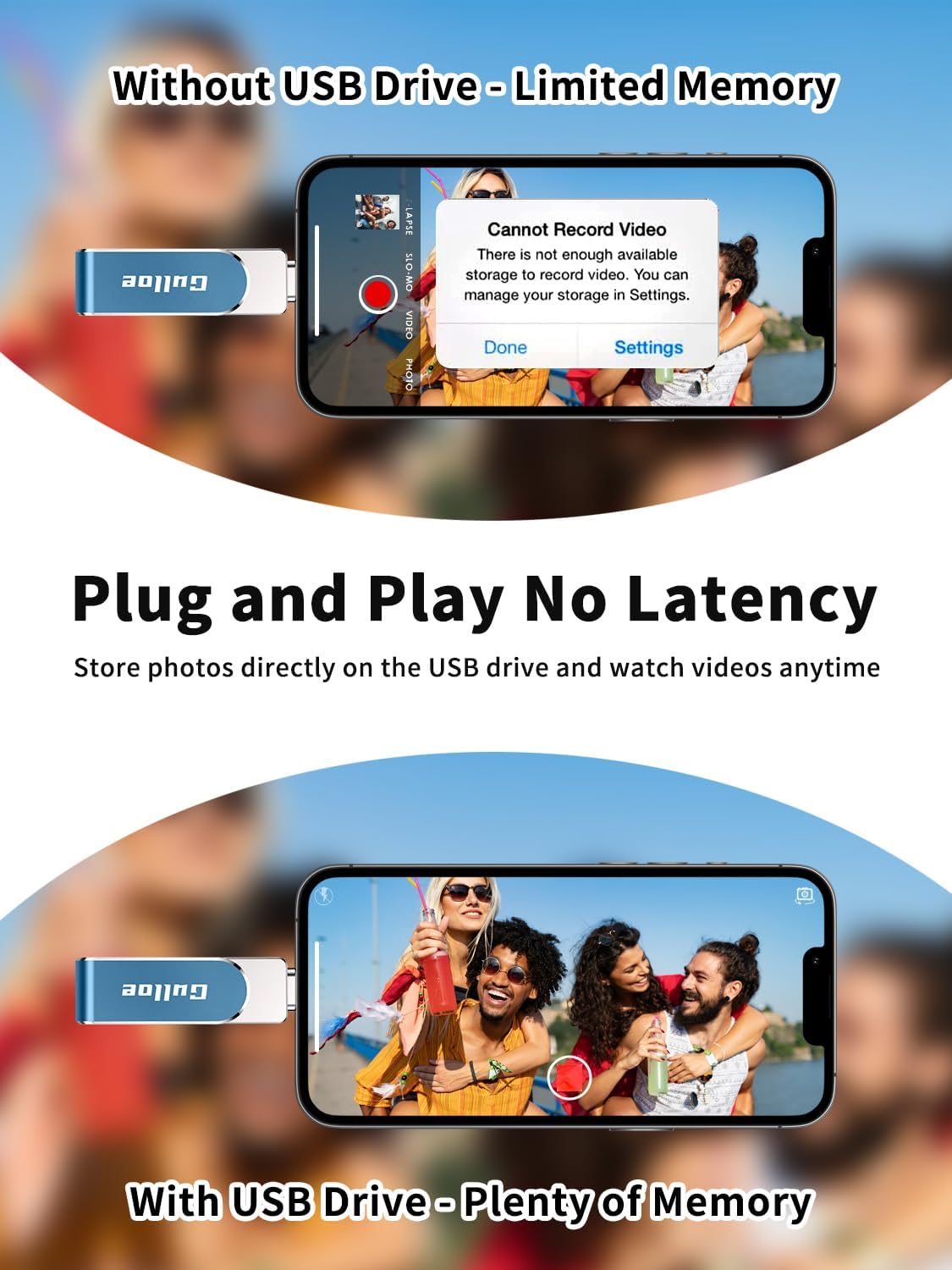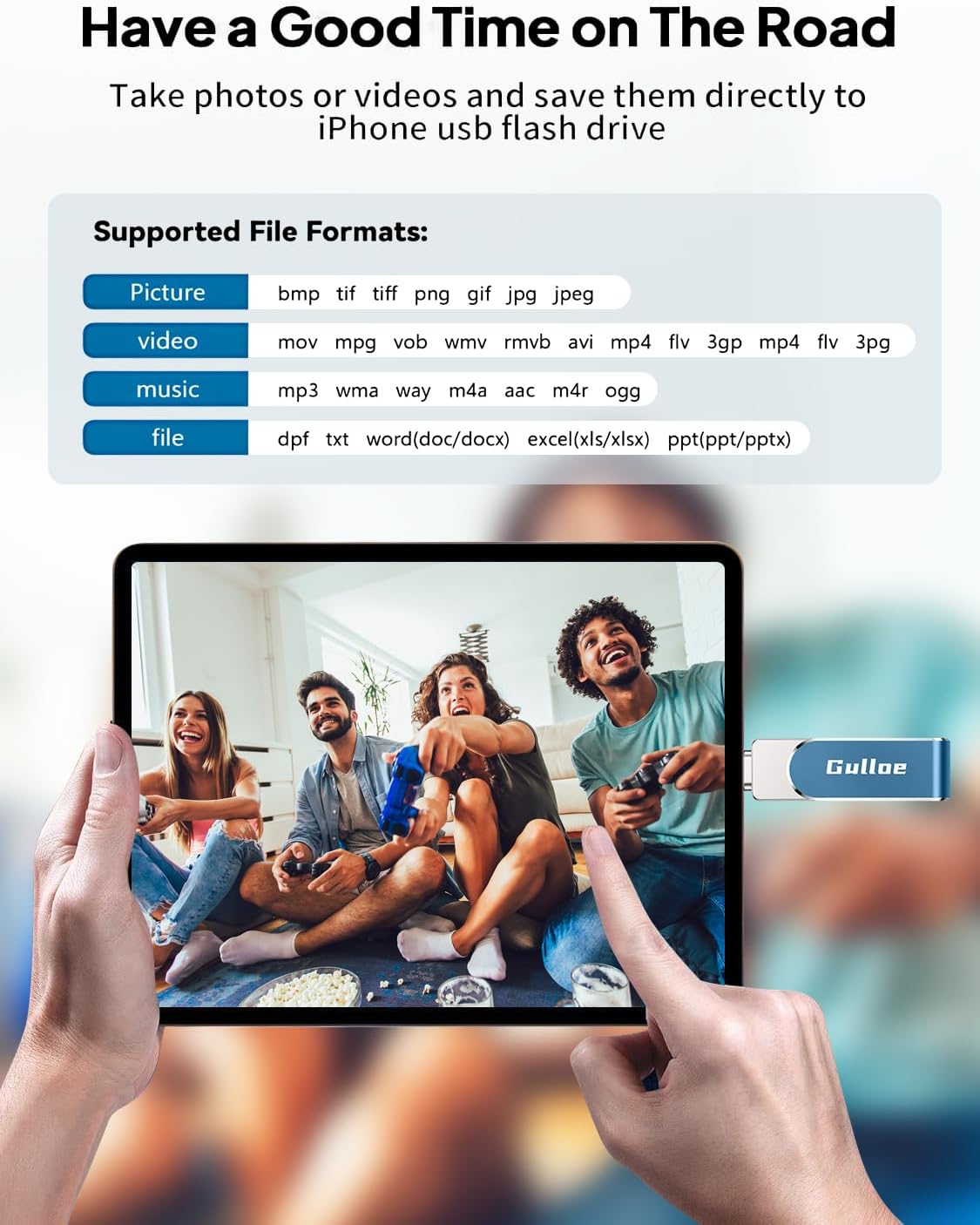 - 【Watch Movies, Photos and Play Music Directly From Phone Flash Drive】Store your favorite videos, audios and music on your iPhone's Photo Stick, then seamlessly plug and play on your iPhone or iPad anytime, anywhere. No more need for Internet or WiFi. This iPhone storage device plays videos in many different formats. Pictures stored on the Phone storage device also support different formats. Great way to store all your pictures and videos on an phone external storage device.