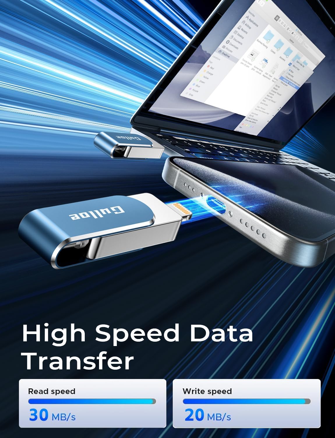 - 【High Transfer Speed】Transfer photos, videos, and files in seconds with our USB stick. With a write speed of up to 15 MB/s and a read speed of up to 30 MB/s, our flash drive for iphone have higher performance than conventional usb storage flash drive. Save time and get more done with iphone photo storage stick. Enjoy the whole relaxing trip with never stuttering or buffering video play on the go. (Tip: No Third-Party Apps Required, Simply insert the flash drive into the iPhone iPad and go to "Files" app)