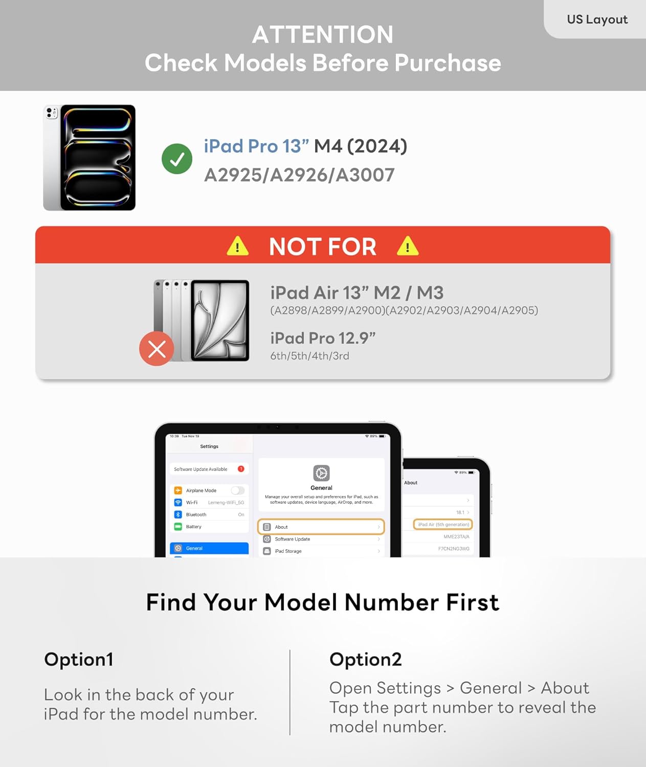 - 【Compatibility】- This keyboard case is designed for iPad Pro 13” M4 2024 (A2925,A2926,A3007). Find Your Model: Setting → General → About → Model Name and number. Please check your iPad model before purchase [Not for Pro 12.9” 3-6th] [Not for Air 13”].