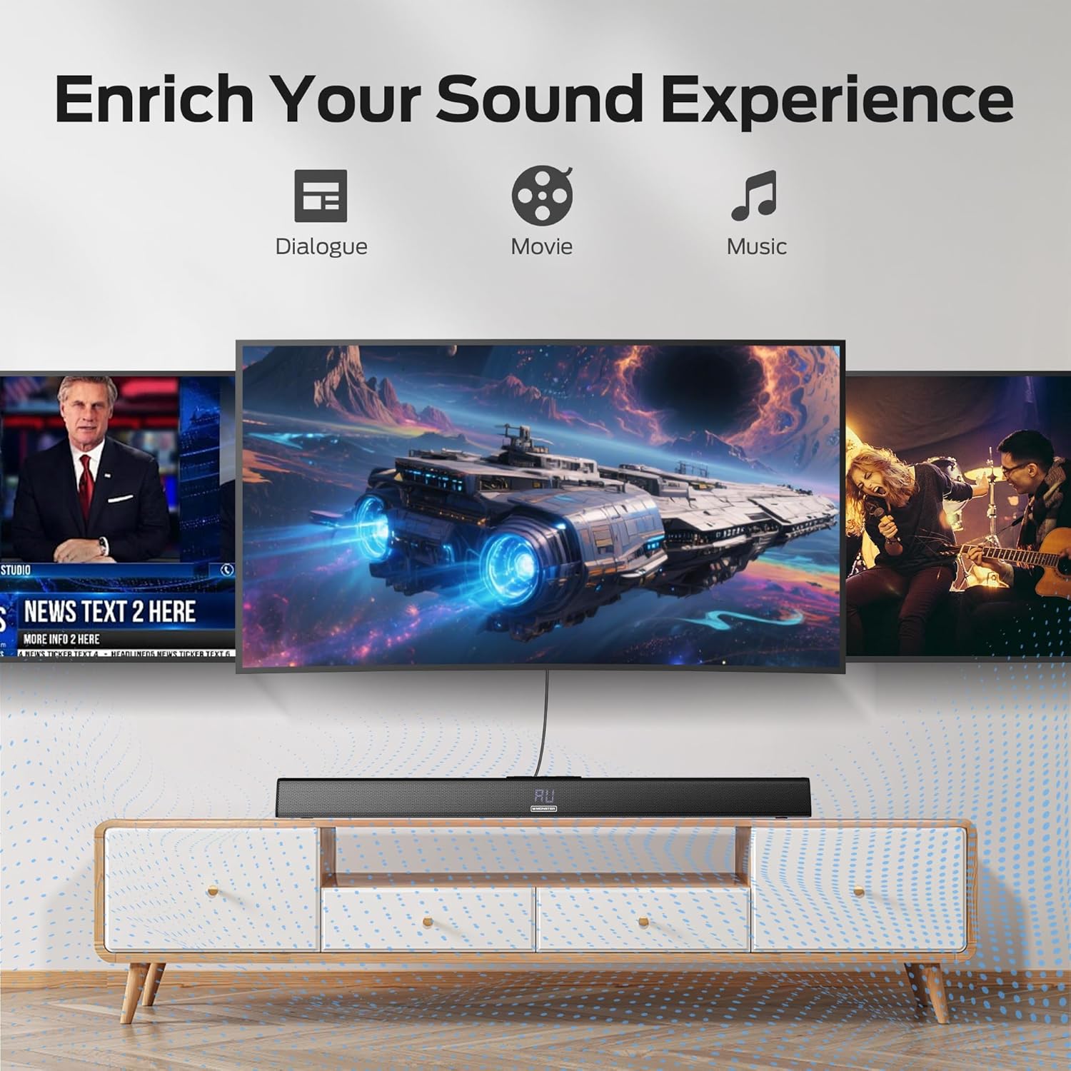 - 【Advanced DSP Technology】 Experience superior audio-visual quality with our state-of-the-art DSP technology. The soundbar enables you to switch between 3 EQ effects (movie, music, and news). Each mode is designed to enhance audio performance for specific content, ensuring that dialogue is clear in news broadcasts, explosion sounds are immersive in movies, and bass is rich in music.