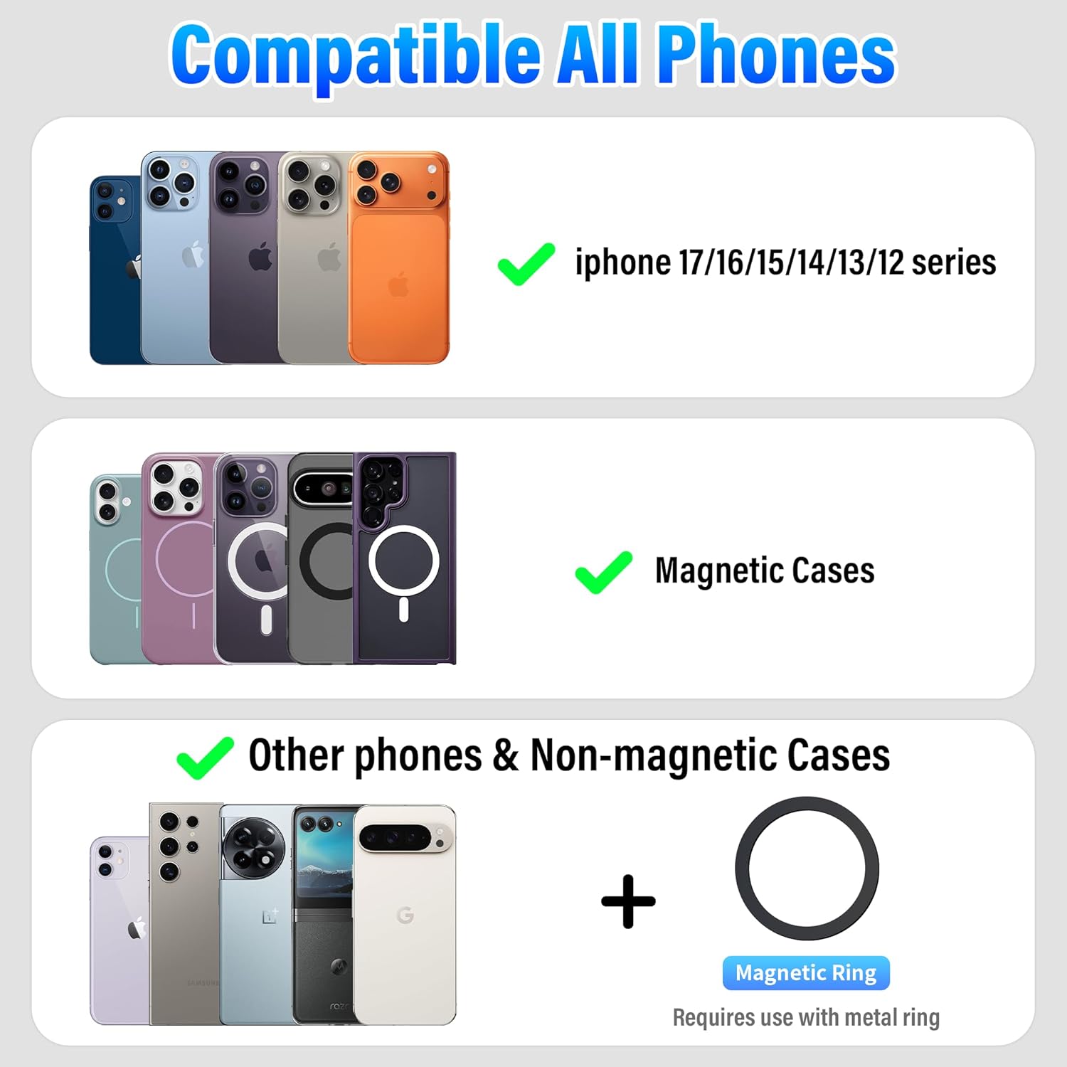 - ššØš¦š©ššš¢šš„š š°š¢šš” šš„š„ šš”šØš§šš¬: This magsafe phone stand is directly compatible with iPhone 17/16/15/14/13/12 series and MagSafe phone cases. We also comes with a magnetic ring that provides the same strong magnetic fixation function for Non-MagSafe phones