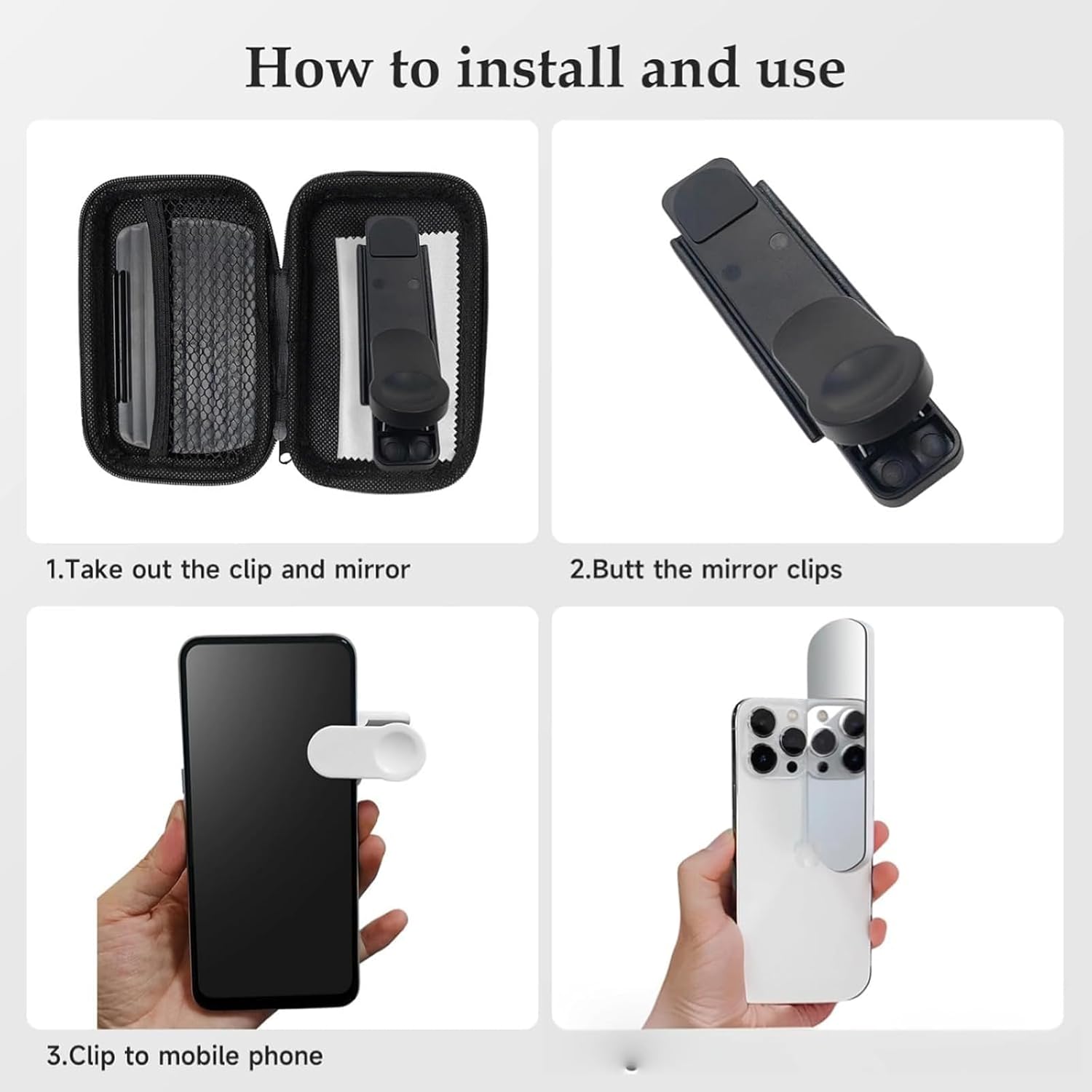 - 【Universal Smartphone Clip】Smartphone Camera Mirror Reflection Clip Kit equipped with a secure spring-loaded clip that fits most smartphones, including iPhone 15 Pro Max, Samsung Galaxy, and more, attaching in just seconds