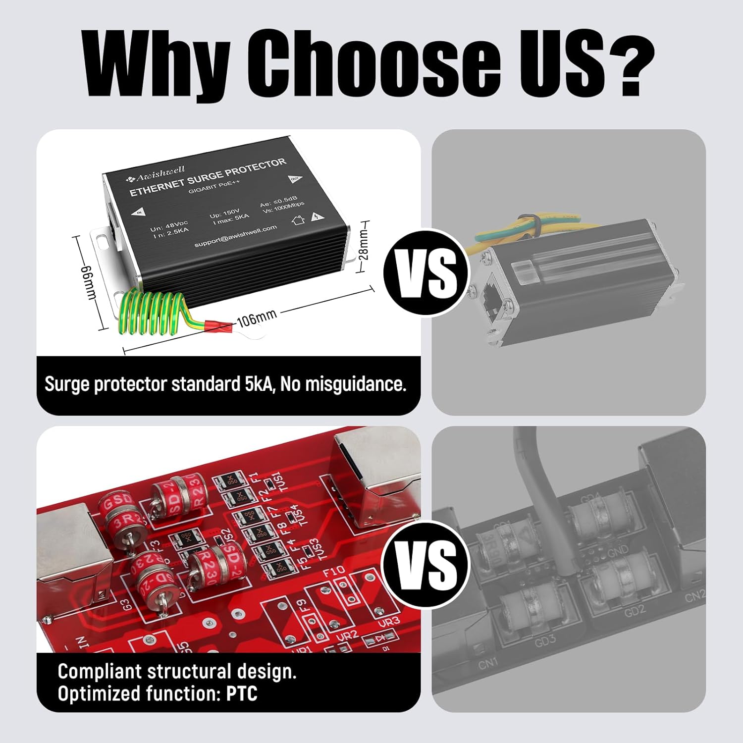 - 【Surge Protection】:Ethernet surge protector is designed to protect equipment against transients from lightning, ESD, and ground surges. Awishwell surge protector supports speeds up to 1 Gigabit -1000 Mbps, and provides PoE++ 802.3af/at/bt compatibility with 3KV surge protection, without affecting network performance. Peak surge current protection up to standard 5KA 8/20μs