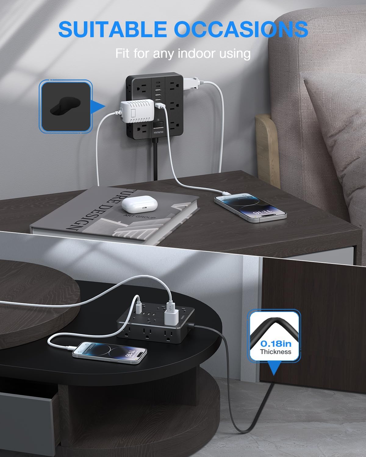 - 18 in 1 Power Strip: This 18-in-1 power strip transforms a single outlet into 12 AC outlets and 6 USB ports (including 2 USB-C), allowing you to charge 18 devices simultaneously without overcrowding. Ideal for home, office, dorm rooms, or any indoor space where you need extra outlets